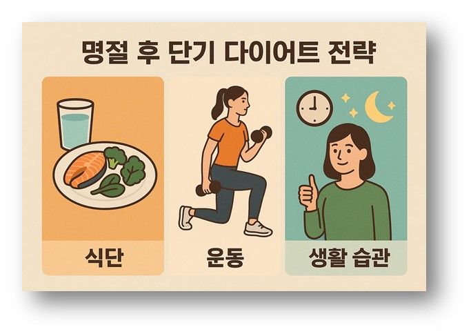 따라서 단기 다이어트는 단순히 체중 감량만이 아니라 연휴로 인해 무너진 생활 리듬과 건강을 회복하는 과정으로 이해해야 합니다. 이번 글에서는 식단, 운동, 생활 습관이라는 세 가지 측면에서 명절 후 단기 다이어트 전략을 구체적으로 살펴보겠습니다.