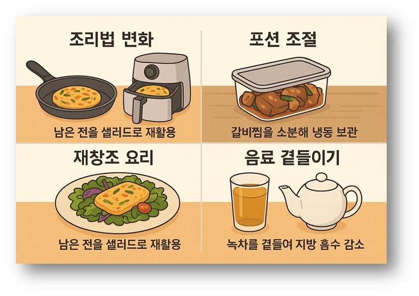 남은 음식의 칼로리를 줄이는 첫 번째 방법은 조리법의 변화입니다. 예를 들어, 기름에 부쳐낸 전은 전자레인지 대신 에어프라이어를 활용해 다시 데우면 남아있는 기름이 빠져 칼로리를 줄일 수 있습니다. 잡채 같은 경우는 기름을 거의 쓰지 않고 채소를 추가해 볶아내면 나트륨과 기름기를 동시에 줄일 수 있습니다. 제가 실제로 시도해본 방법 중 하나는 남은 전을 키친타월로 기름을 닦아내고, 채소를 곁들여 샐러드로 재활용하는 것이었는데, 생각보다 담백해서 오히려 아이들과 함께 즐길 수 있었습니다.