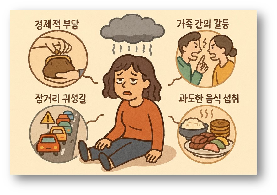 명절 스트레스의 원인은 여러 가지로 나눌 수 있습니다. 우선 경제적인 부담이 큽니다. 선물 준비와 차례 음식 비용은 평소보다 큰 지출을 요구하며, 가계에 압박을 줍니다. 또 다른 요인은 가족 간의 갈등입니다. 오랜만에 만나는 가족과의 대화에서 세대 차이, 가치관 차이, 생활 방식의 차이로 인해 갈등이 불거지기도 합니다. 저 역시 친척들과 대화 중에 미묘한 의견 충돌로 불편한 기류가 형성된 경험이 있습니다. 이처럼 가족이라는 울타리 안에서도 스트레스는 쉽게 발생할 수 있습니다. 여기에 장거리 귀성길의 교통 체증, 과도한 음식 섭취로 인한 소화 불량, 일상 루틴의 붕괴까지 겹치면 명절 스트레스는 쉽게 피로감과 무력감을 동반합니다. 따라서 추석 스트레스는 단순한 기분 문제가 아니라, 건강 관리 차원에서도 반드시 주목해야 할 문제입니다.