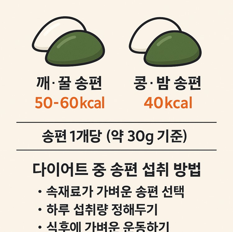송편의 칼로리는 사용되는 속재료에 따라 크게 달라집니다. 예를 들어, 깨와 꿀을 넣은 송편은 당 함량이 높아 한 개당 50~60kcal에 이를 수 있고, 콩이나 밤이 들어간 송편은 상대적으로 칼로리가 낮아 약 40kcal 정도입니다. 이 차이를 알면 다이어트 중에도 조금 더 안전하게 선택할 수 있습니다. 저의 경우 예전에는 고소한 깨송편을 즐겨 먹었는데, 체중이 늘어난 경험 이후로는 콩이나 밤송편을 주로 선택해 부담을 줄이고 있습니다.